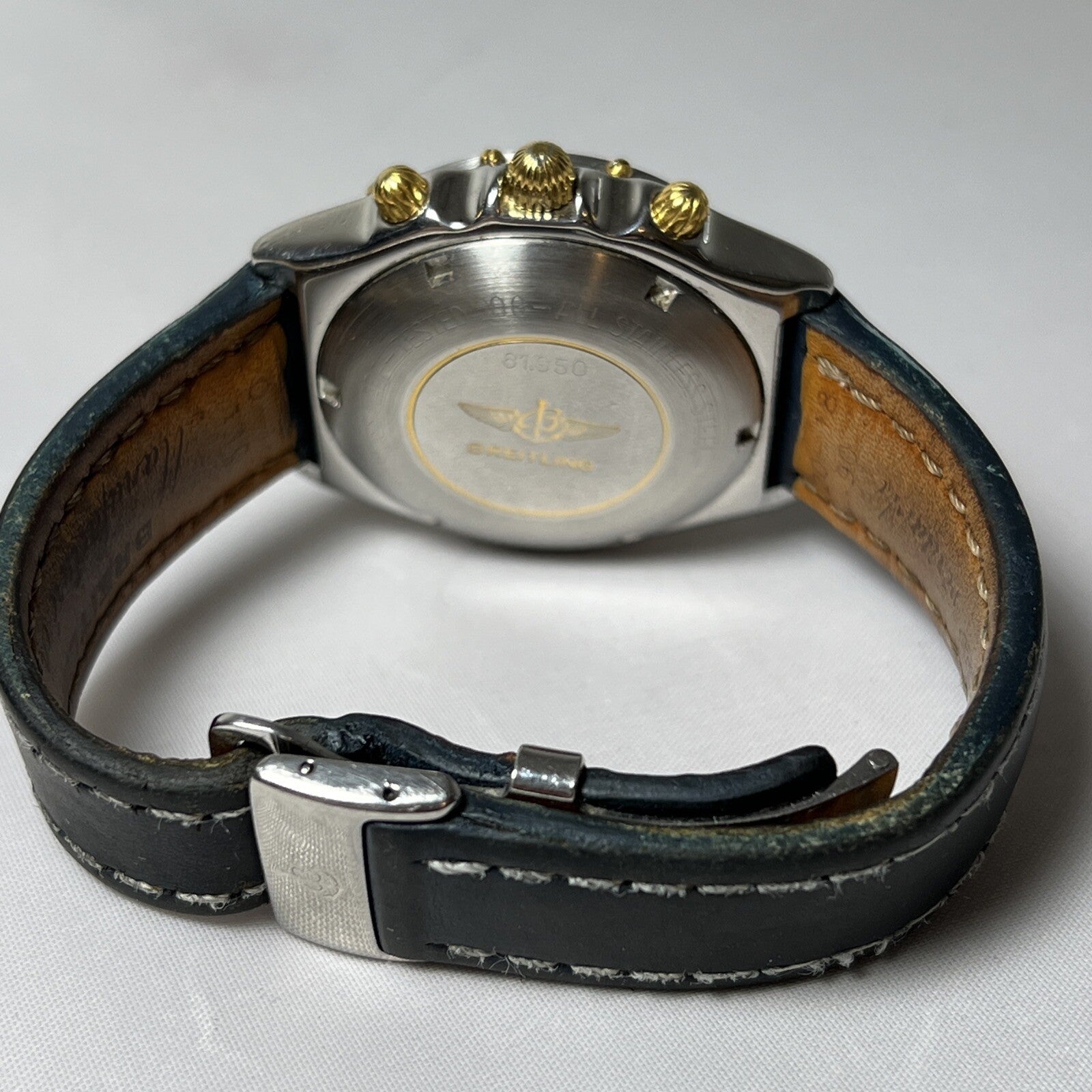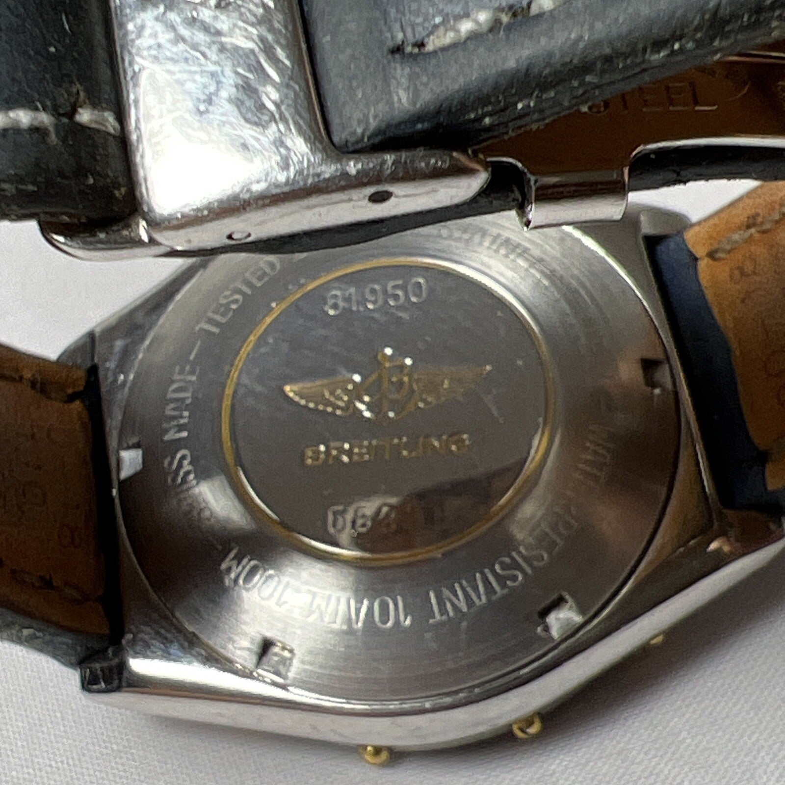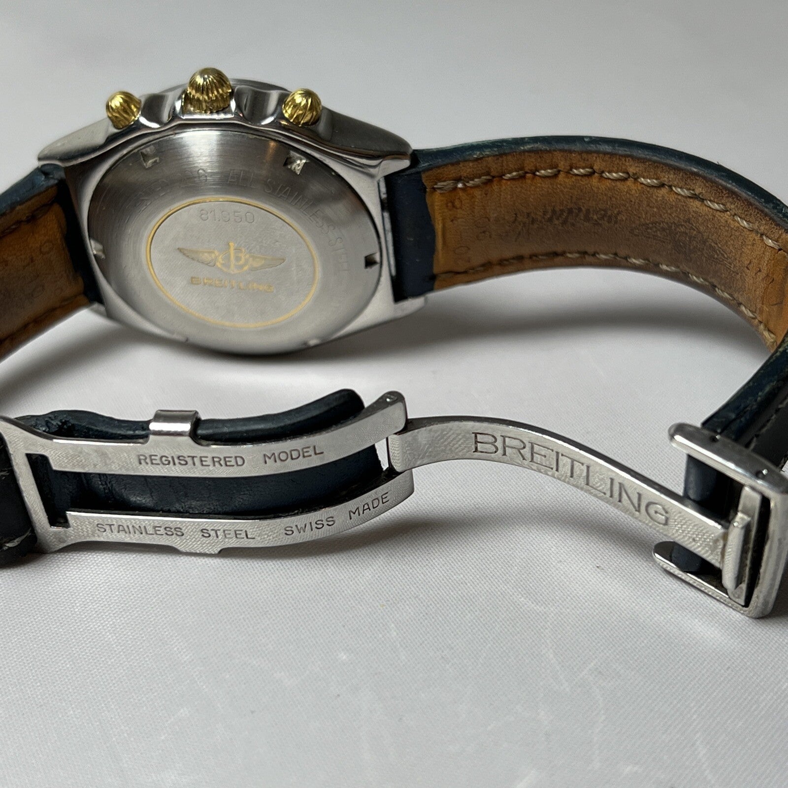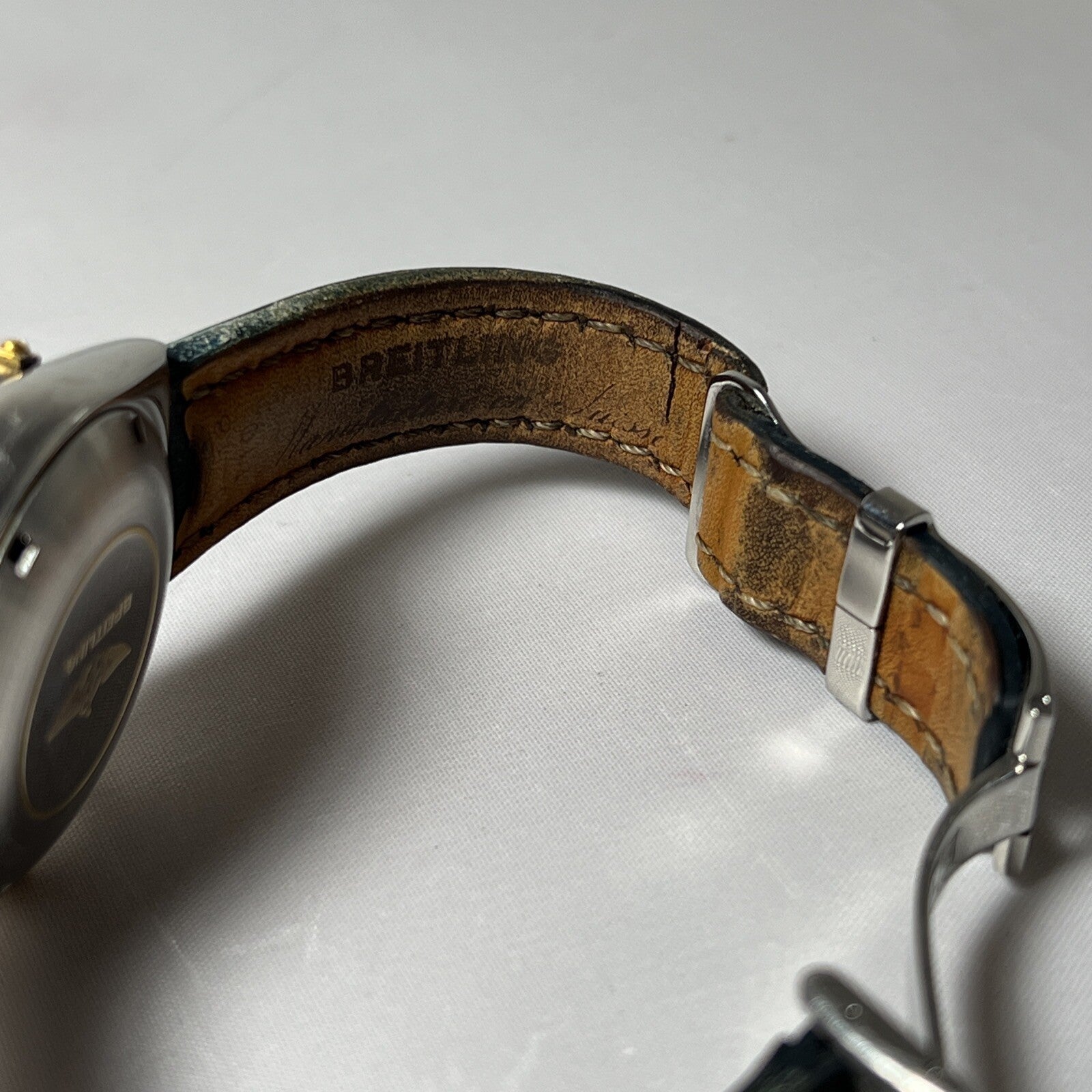 The band and deployant clasp are authentic Breitling, and they are very worn. The clasp is stainless steel and can be polished to look like new, if desired.
