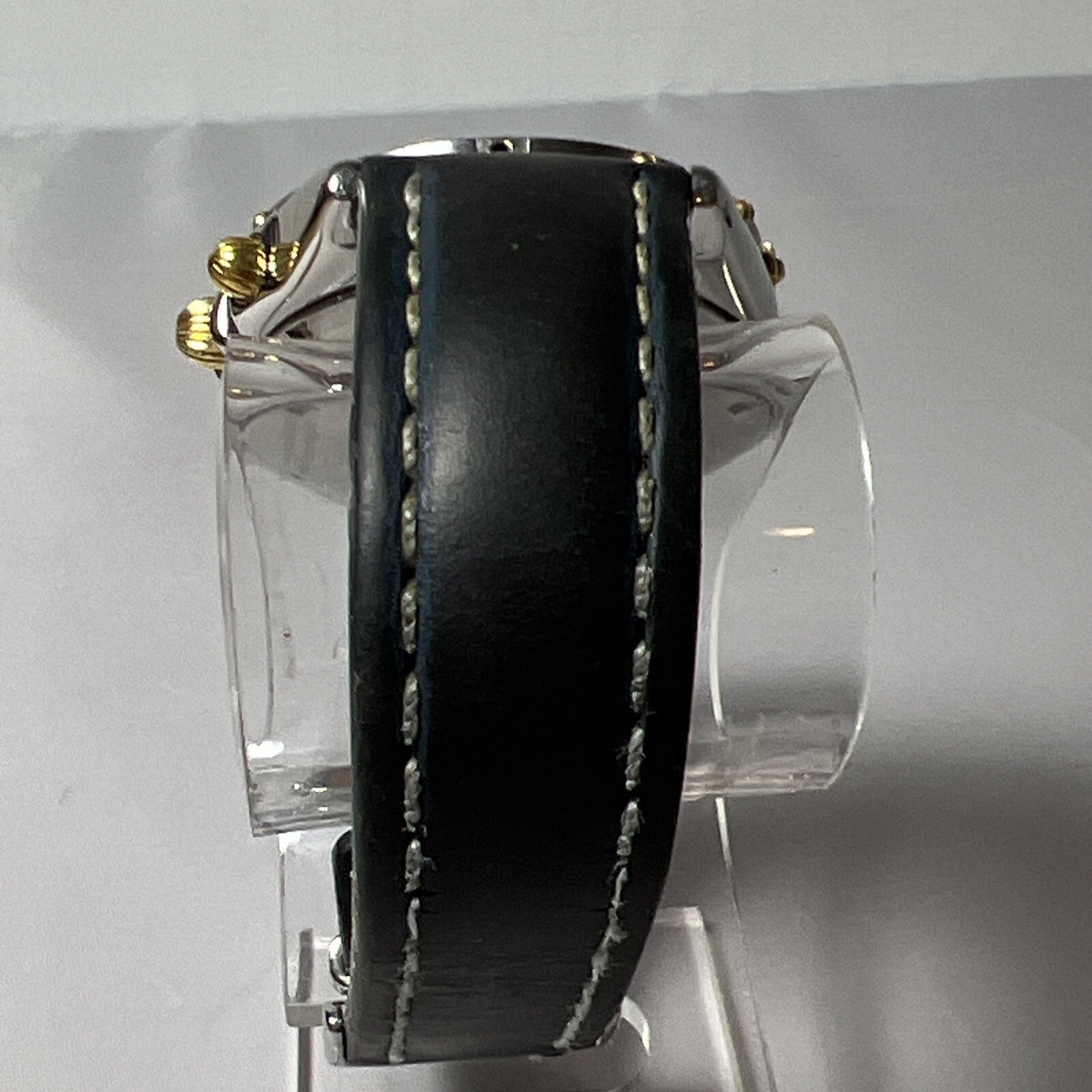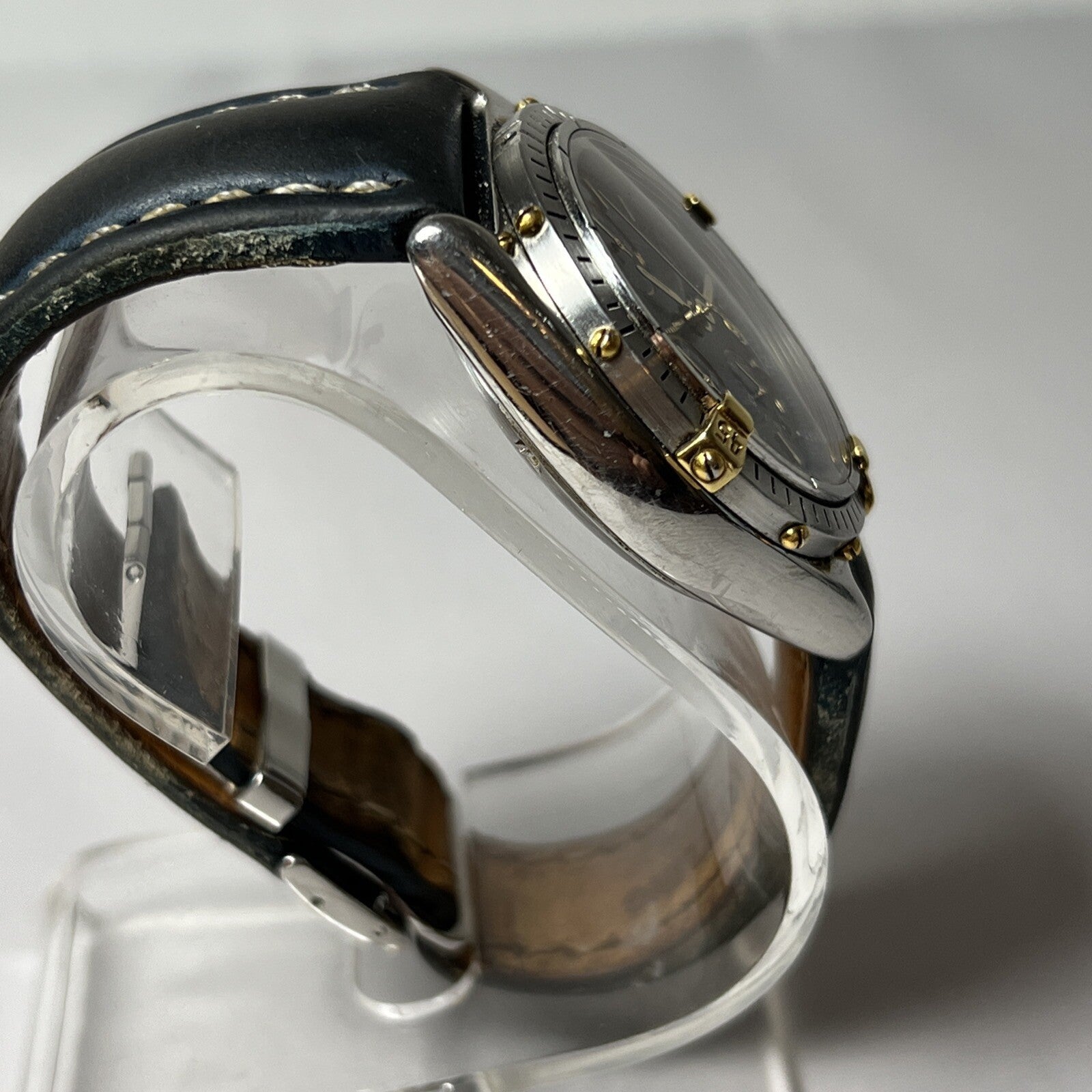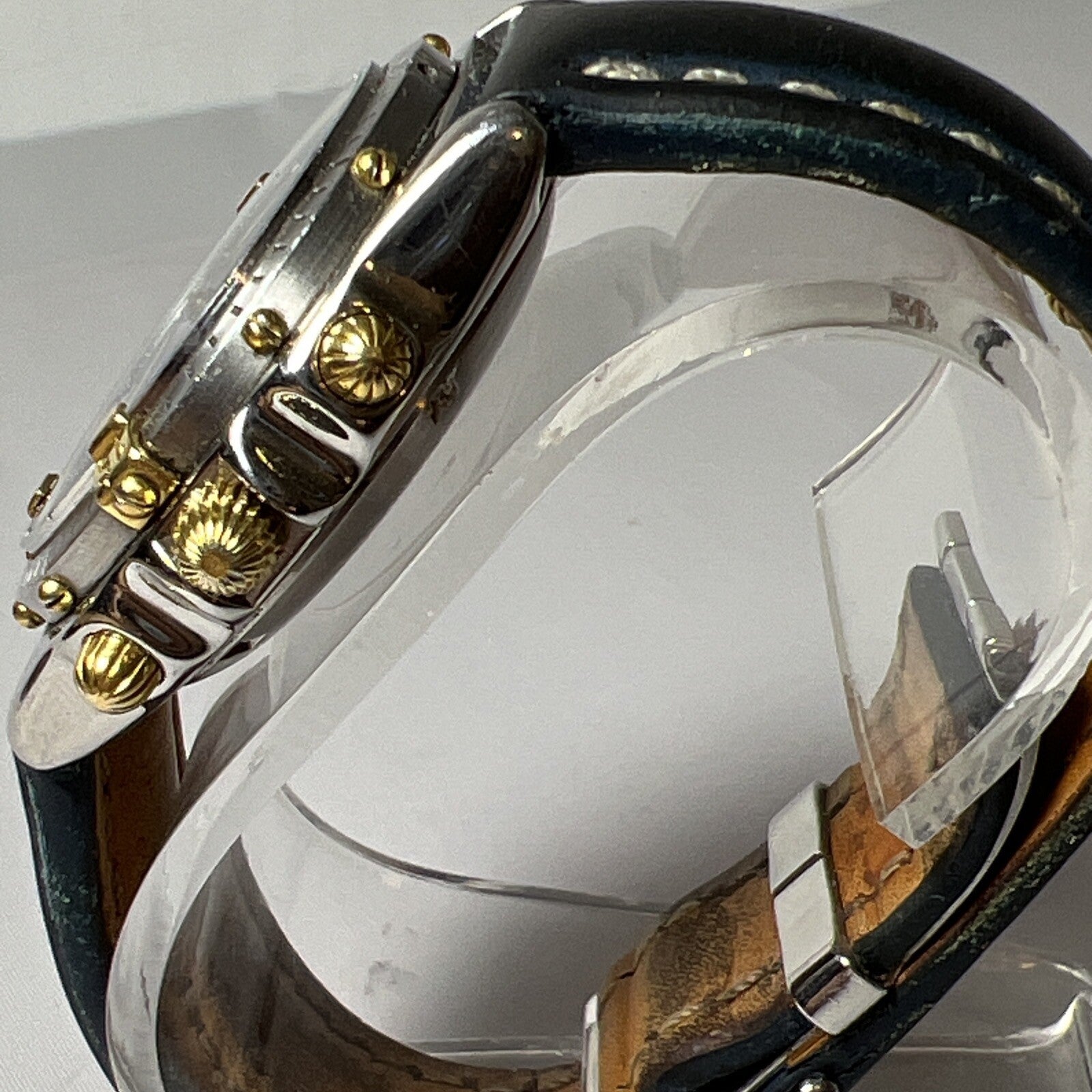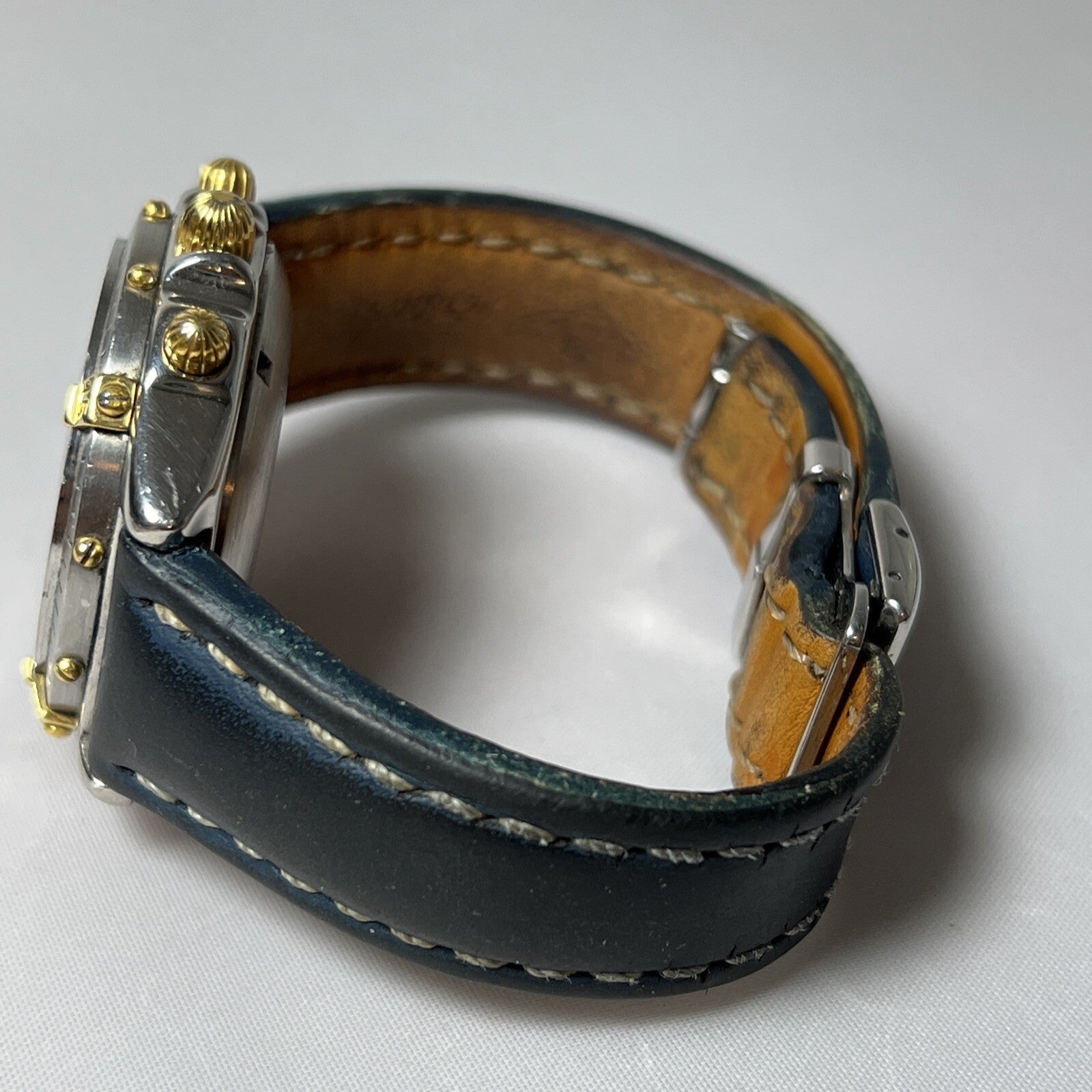 The band and deployant clasp are authentic Breitling, and they are very worn. The clasp is stainless steel and can be polished to look like new, if desired.