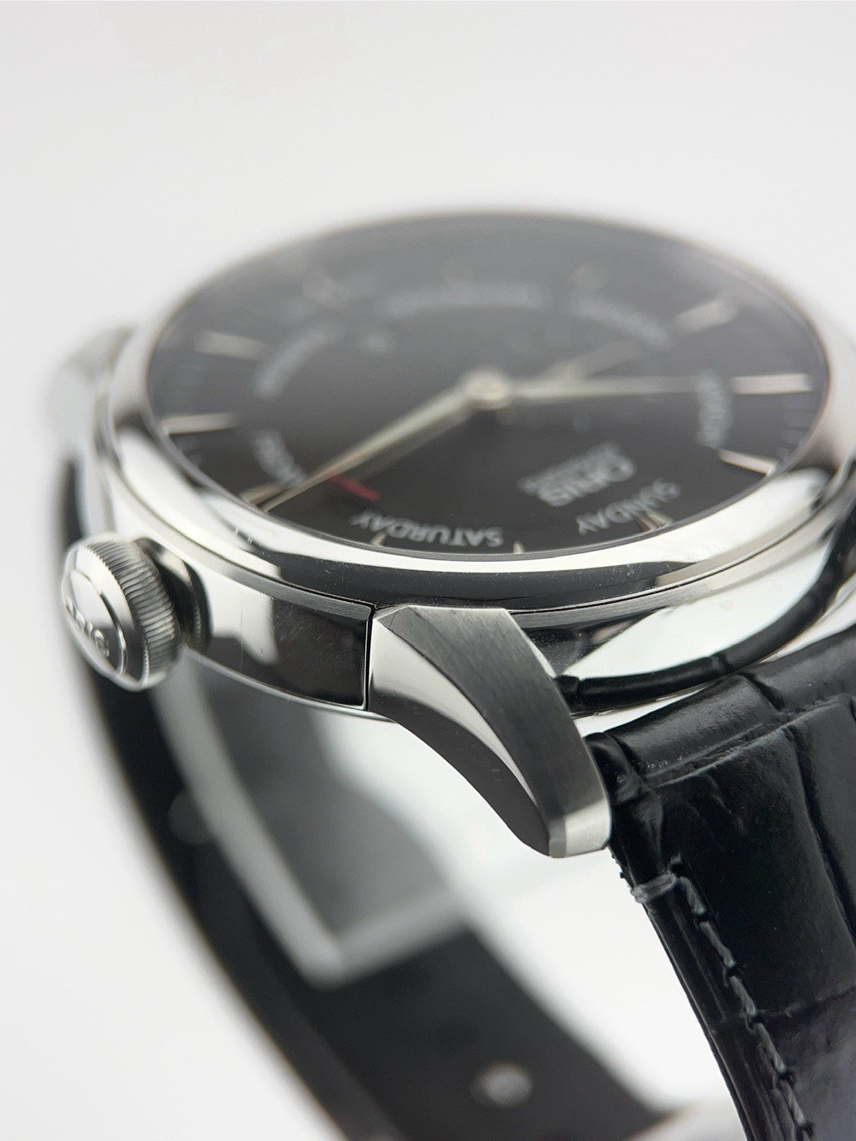 Condition: The watch is in pre-owned condition. There are hairline scratches throughout the case but nothing worth noting. The leather strap is in good condition with lots of life left. Overall the watch is in nice shape.